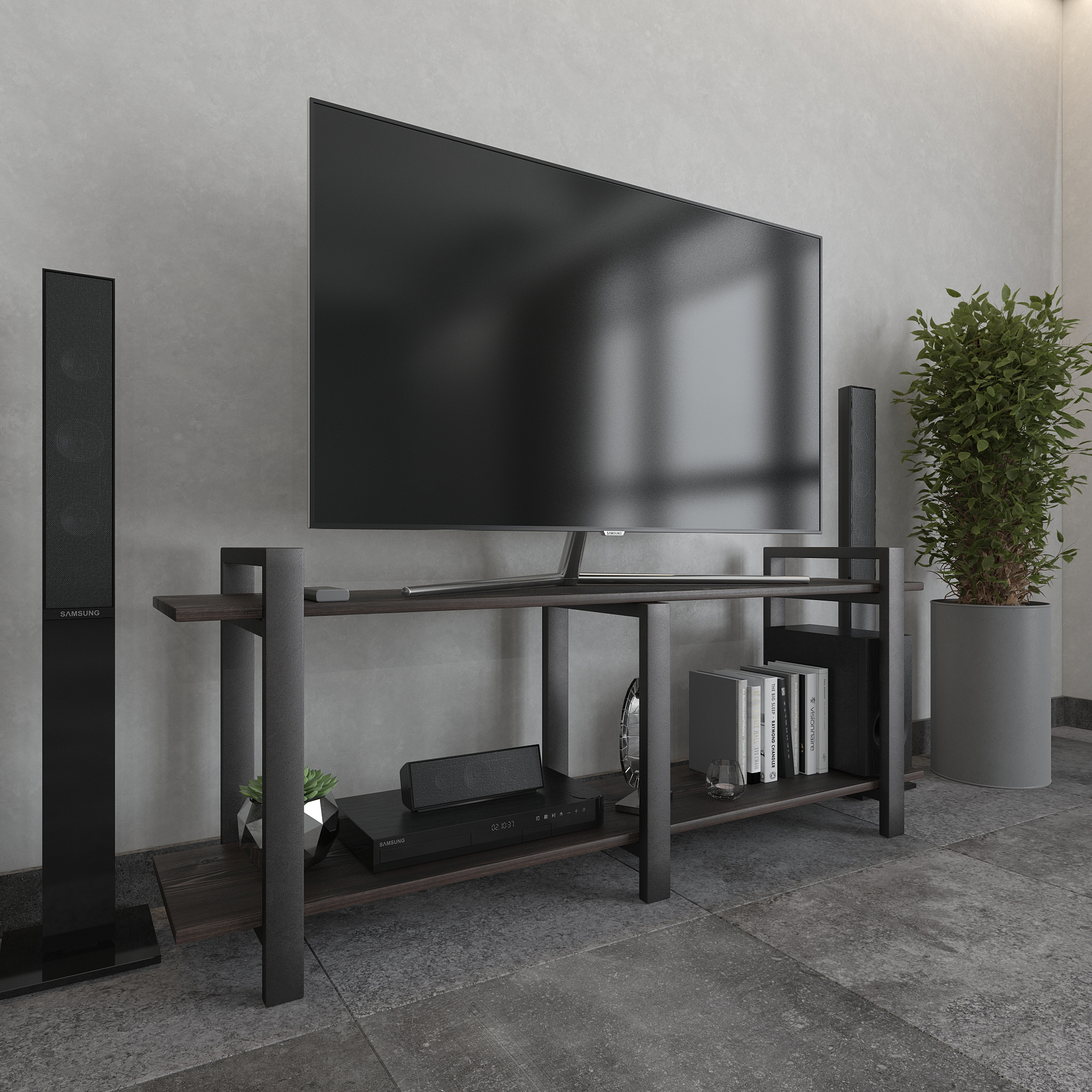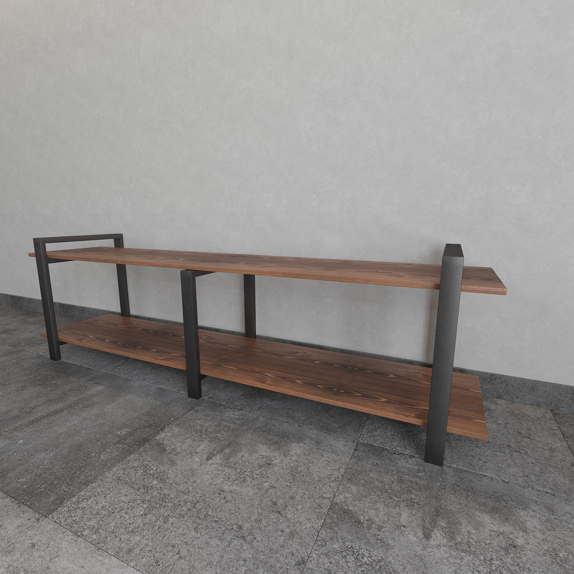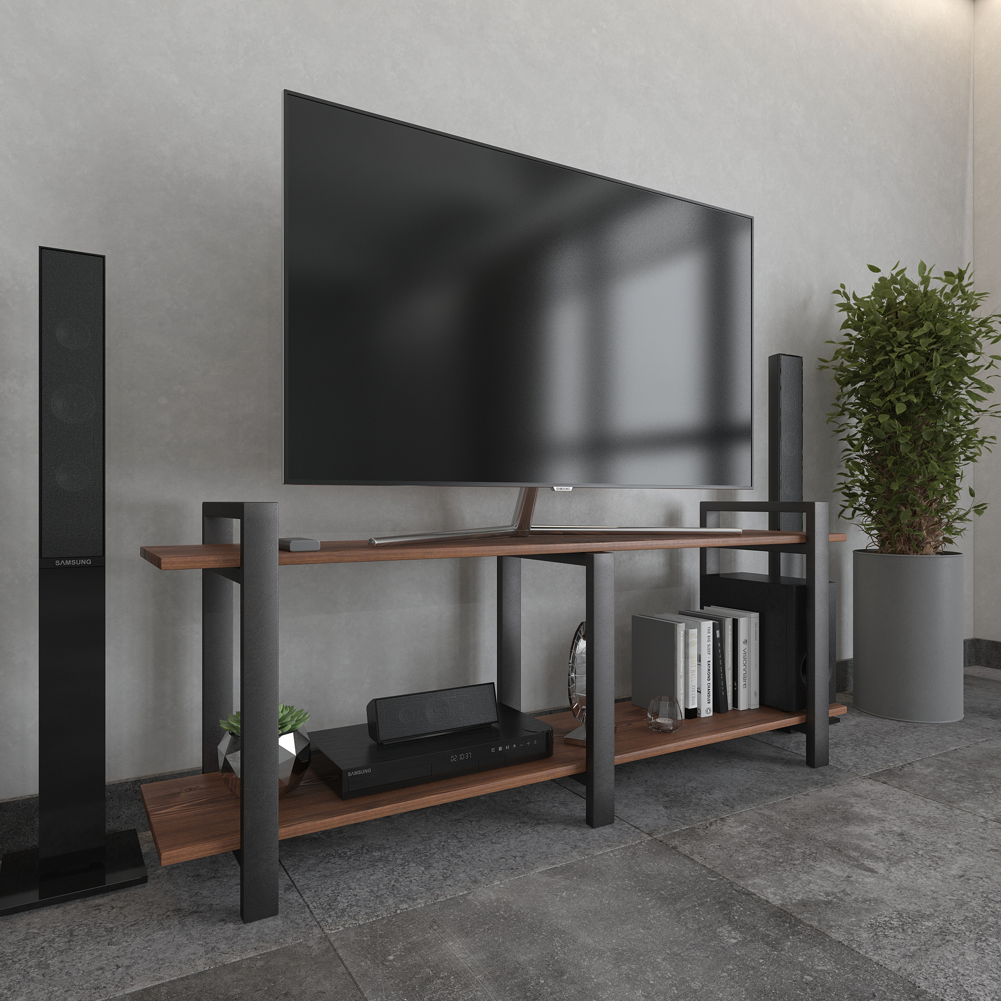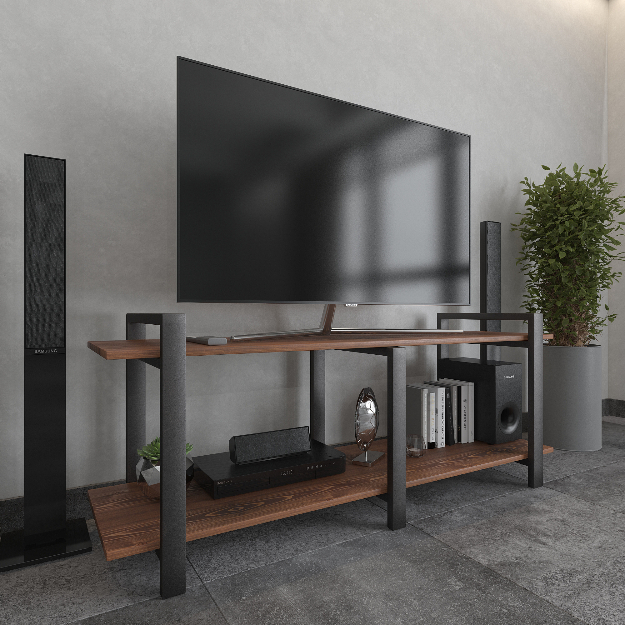 Современная тумба под телевизор из натуральной сосны и стали — функциональное интерьерное решение для гостиной в стиле лофт, минимализм и современный дизайн.