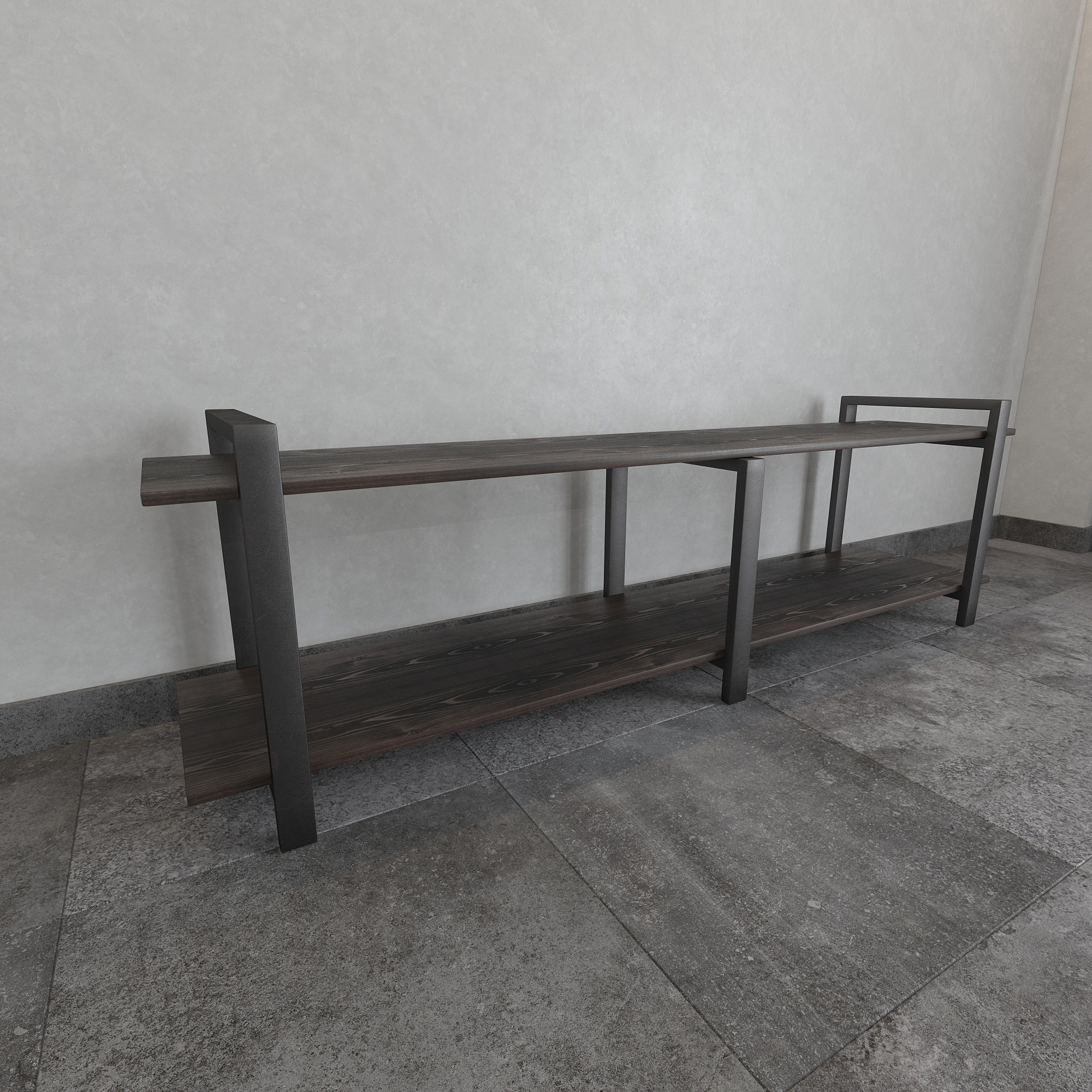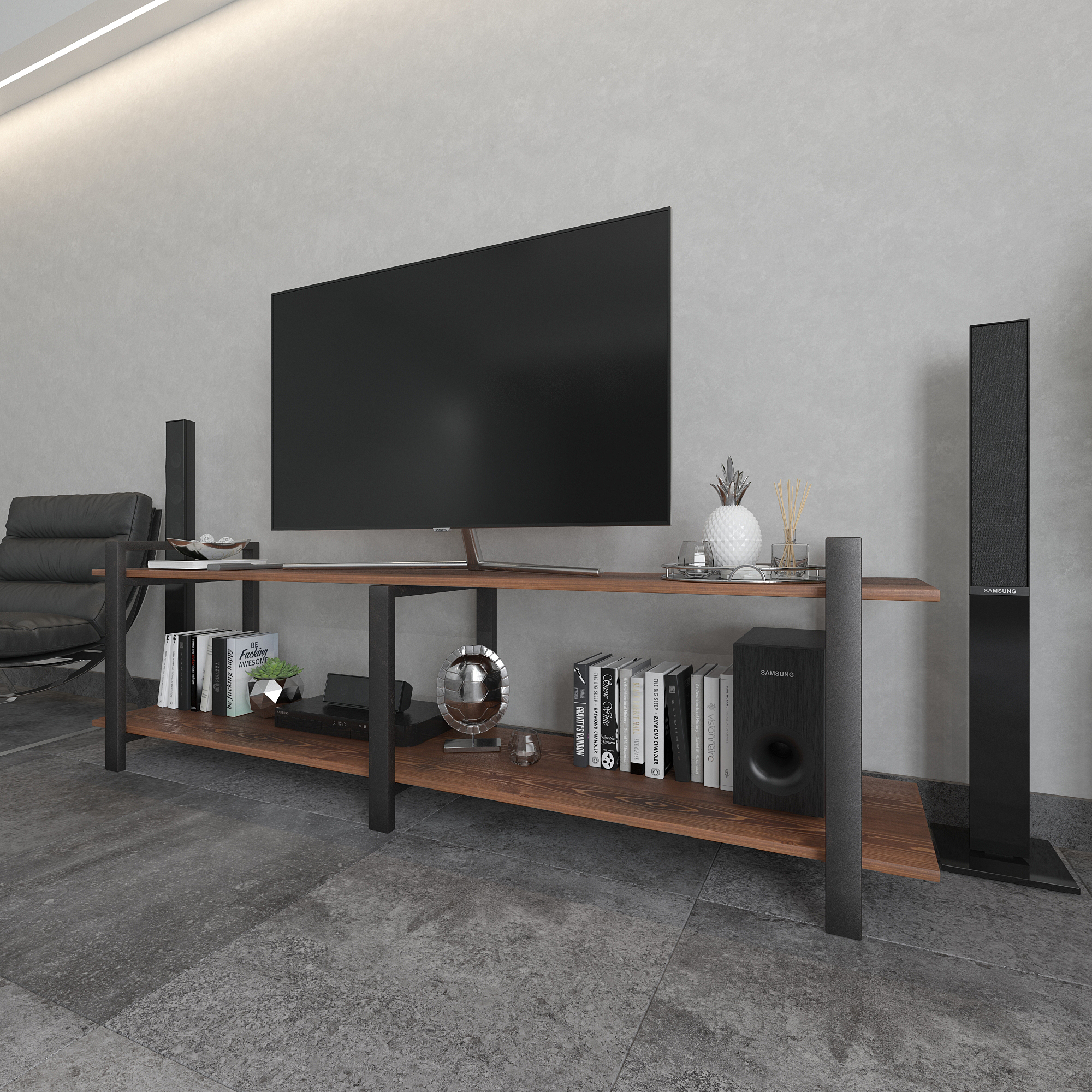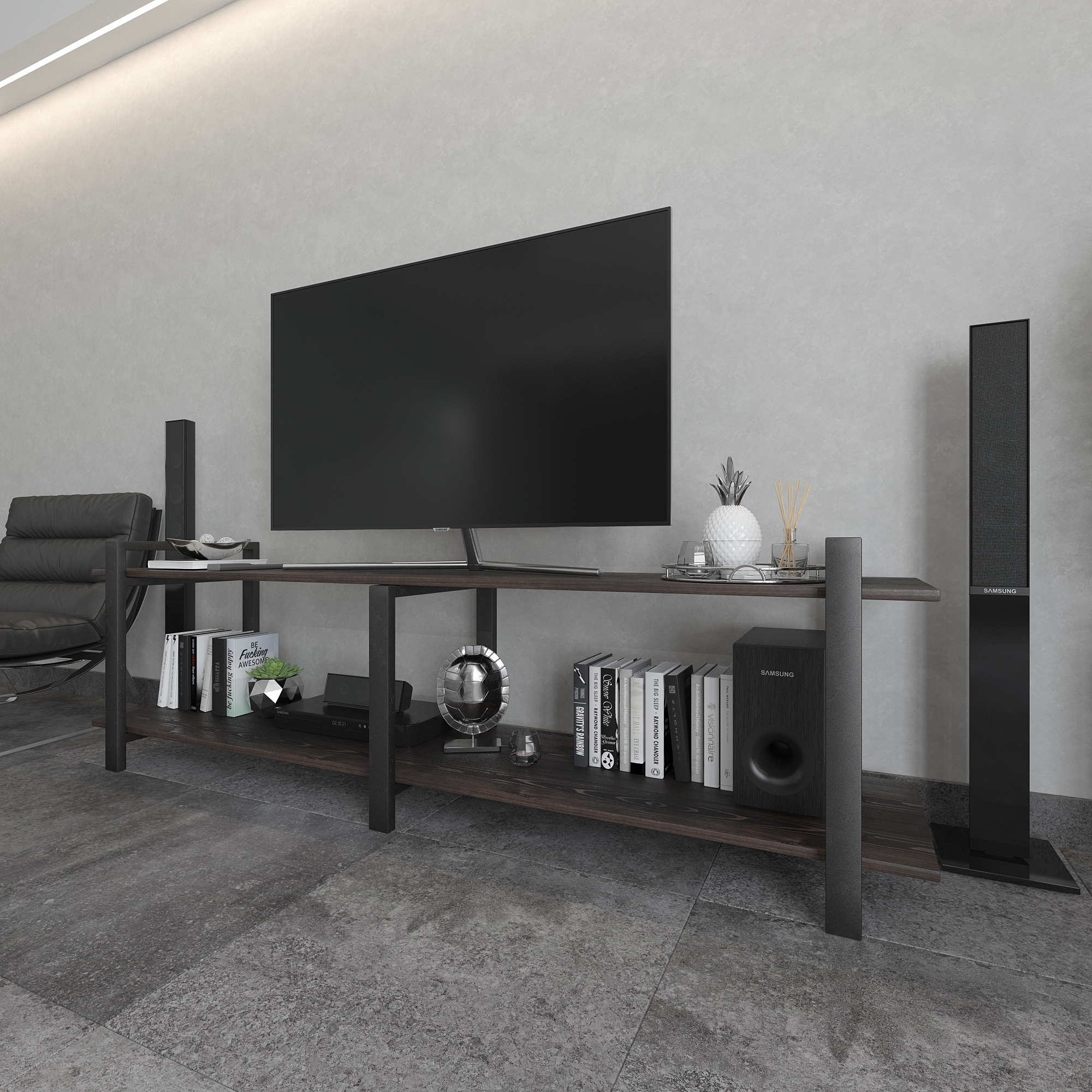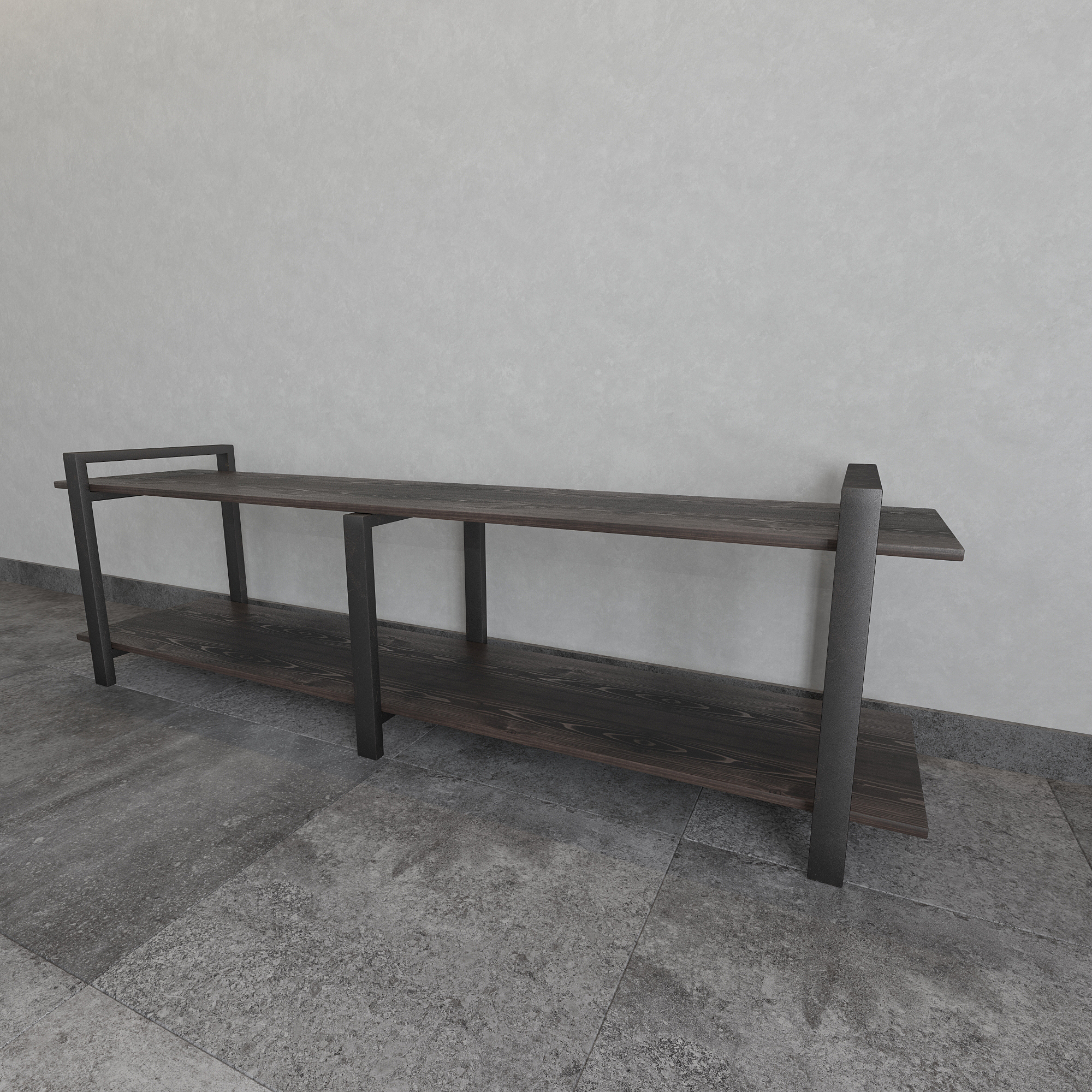 Современная тумба под телевизор из натуральной сосны и стали — функциональное интерьерное решение для гостиной в стиле лофт, минимализм и современный дизайн.