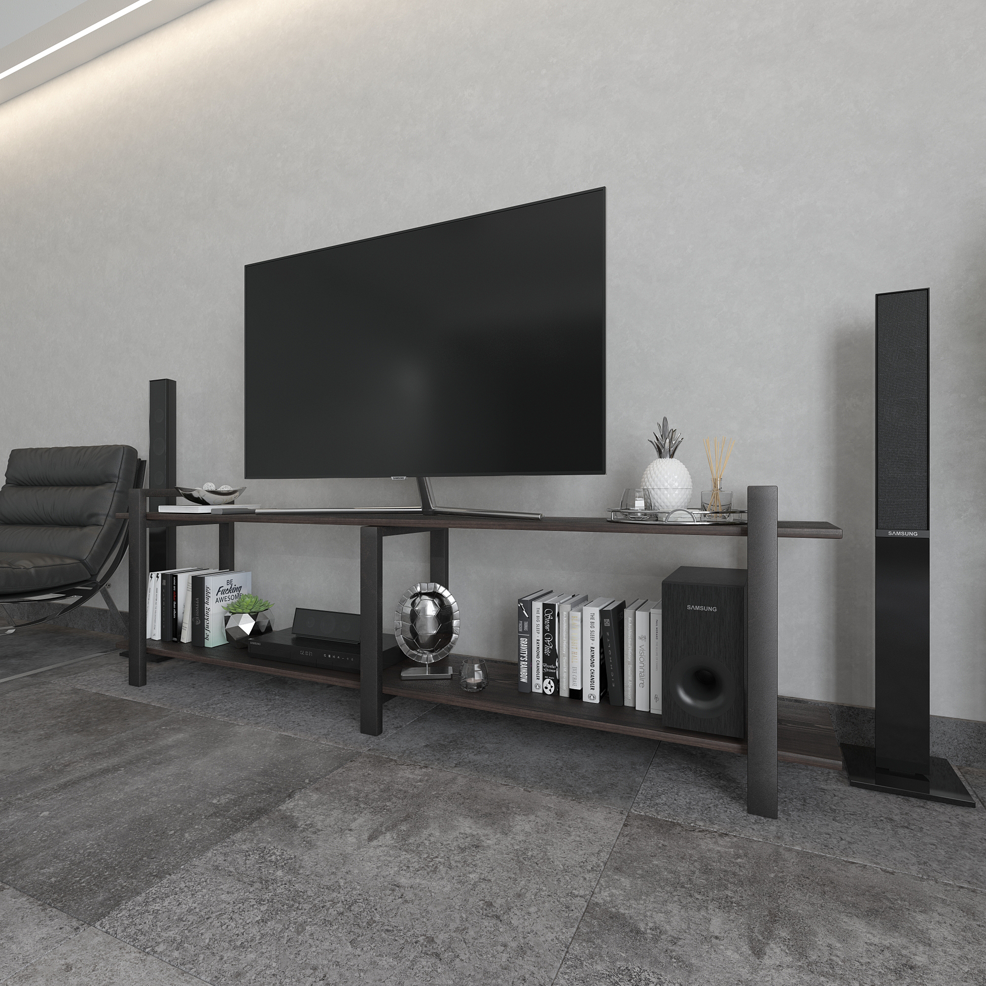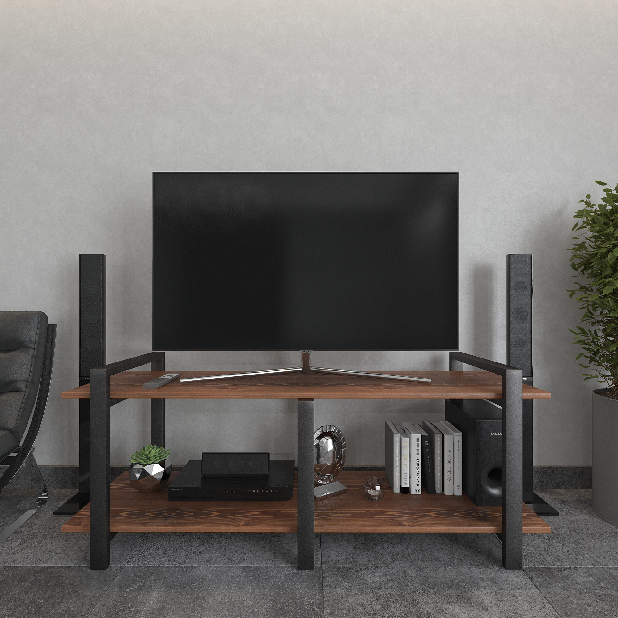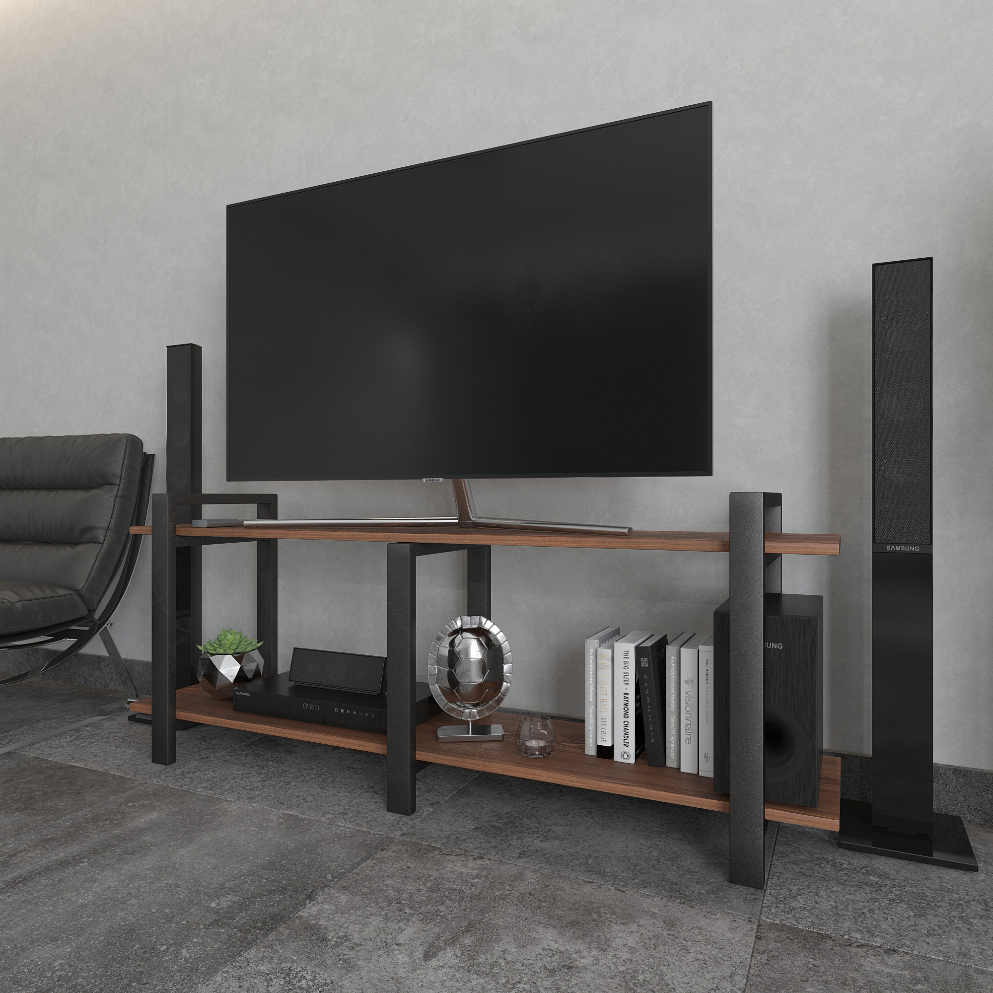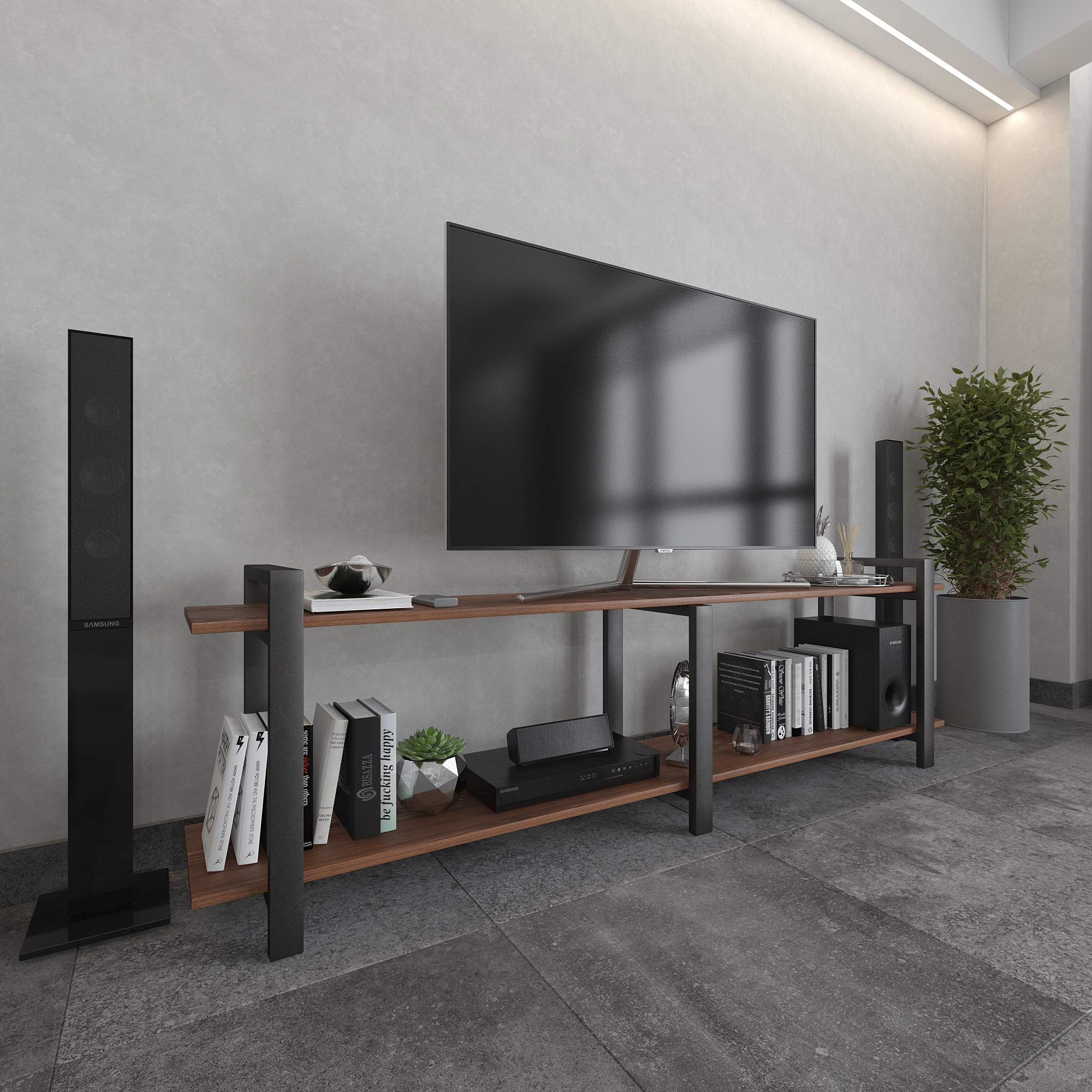 Современная тумба под телевизор из натуральной сосны и стали — функциональное интерьерное решение для гостиной в стиле лофт, минимализм и современный дизайн.