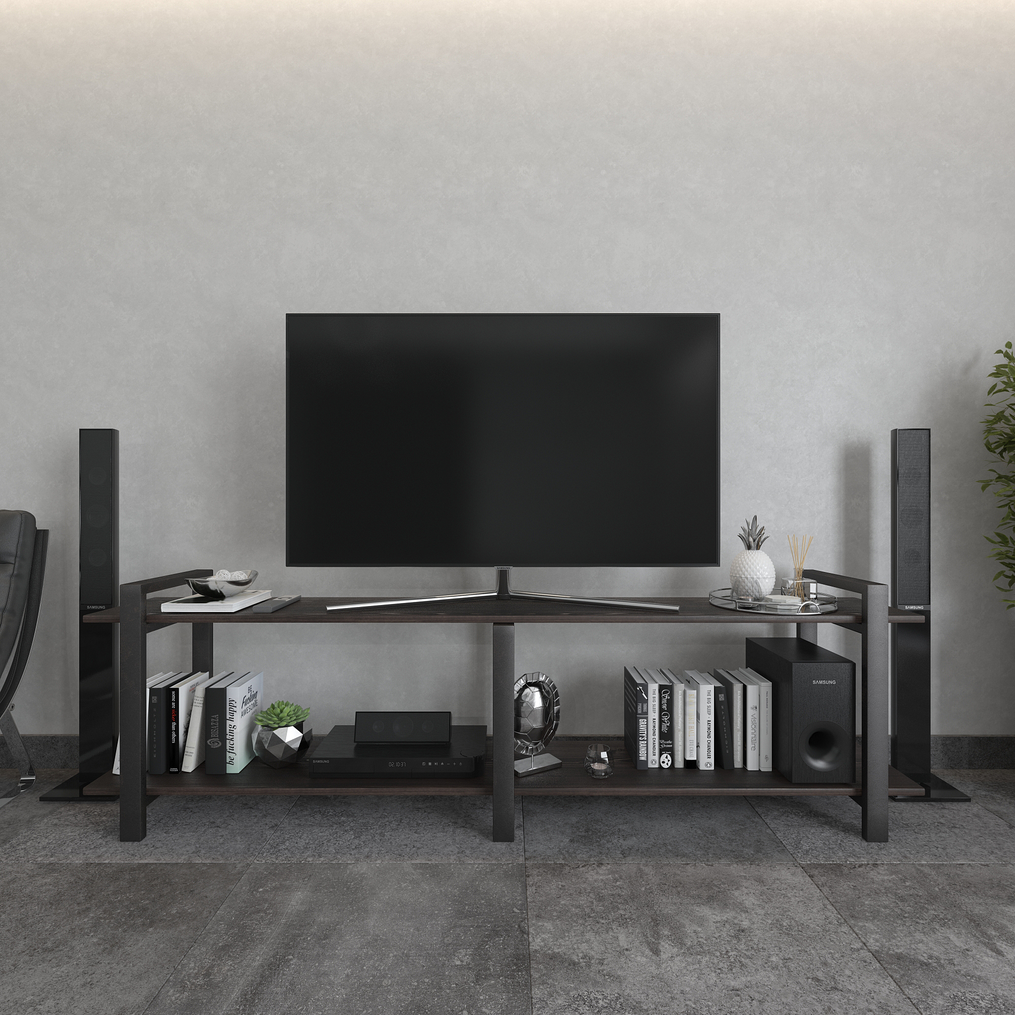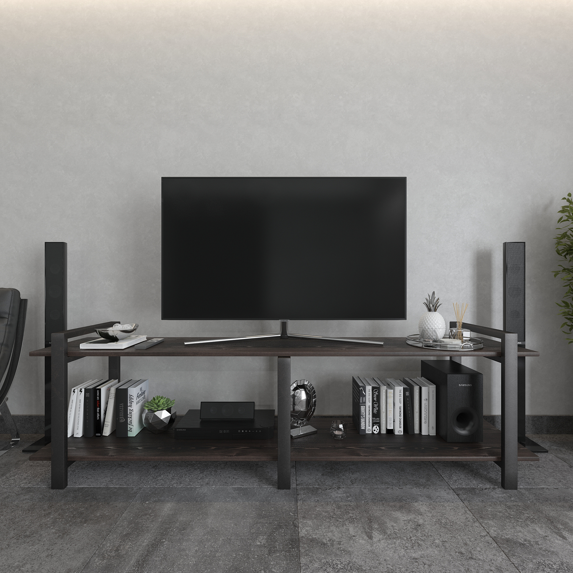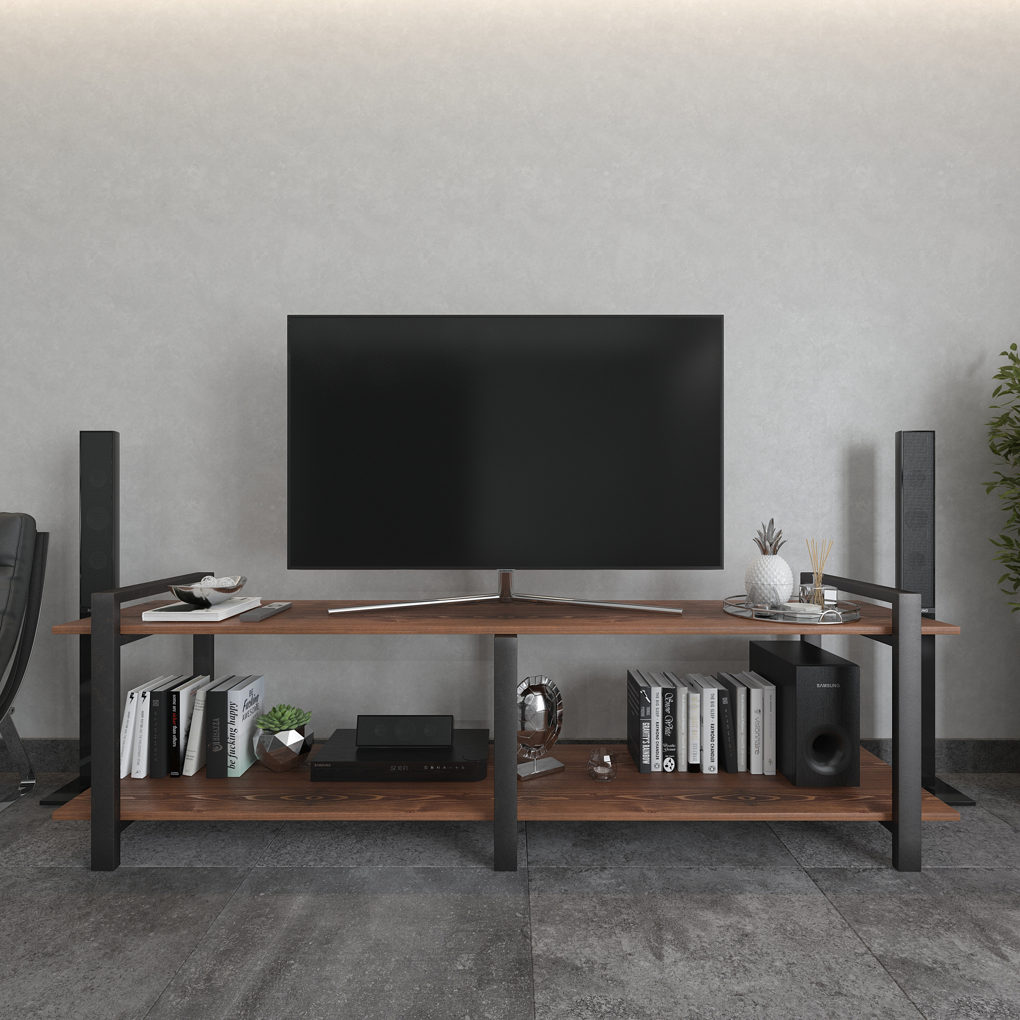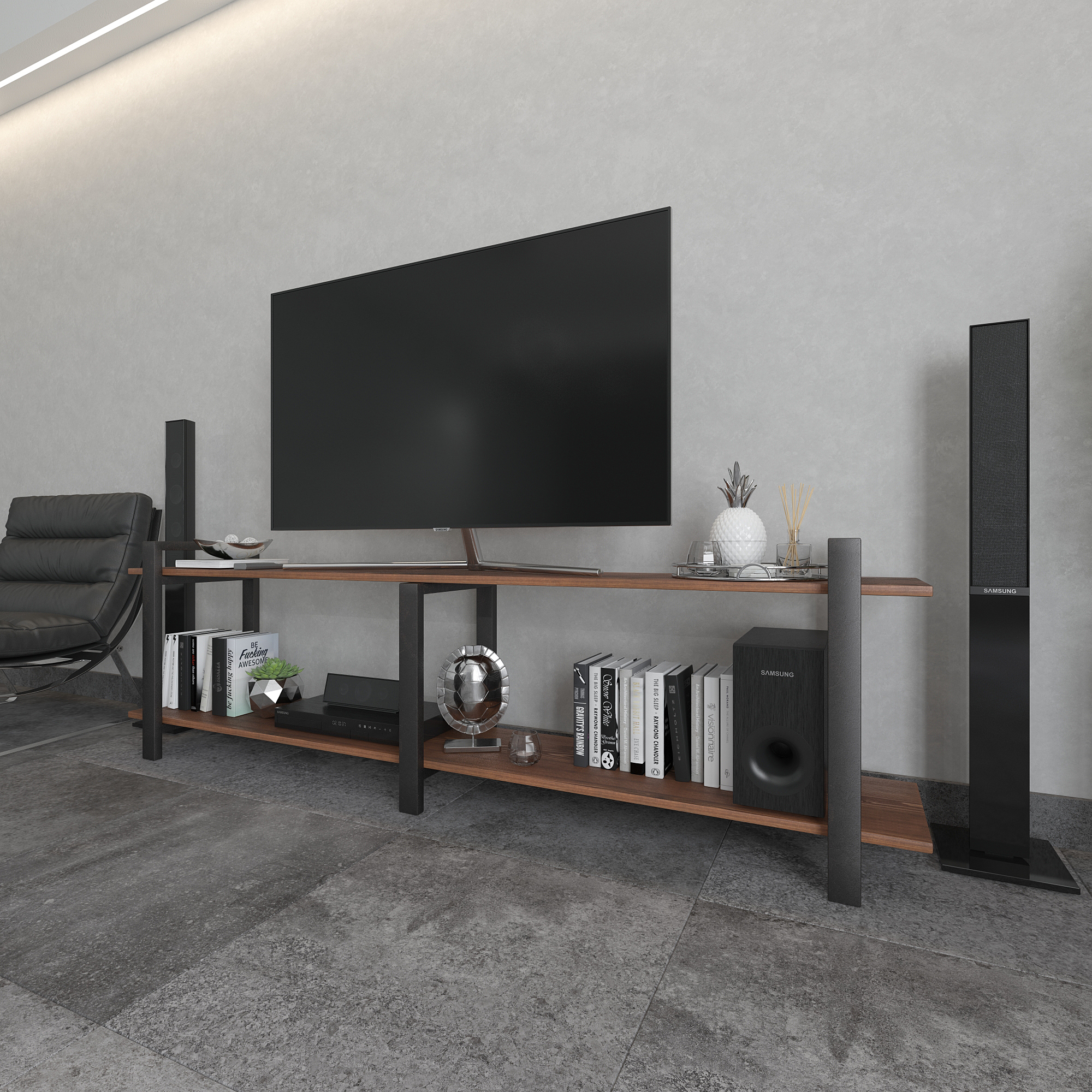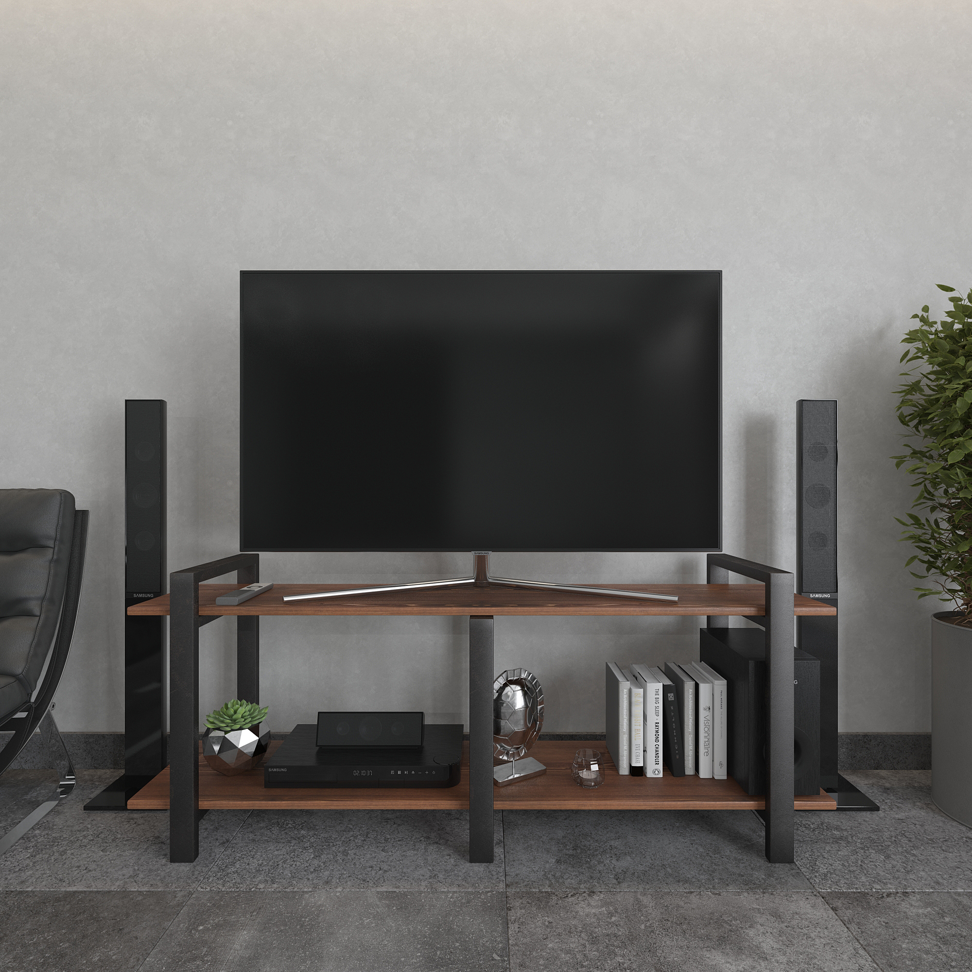 Современная тумба под телевизор из натуральной сосны и стали — функциональное интерьерное решение для гостиной в стиле лофт, минимализм и современный дизайн.