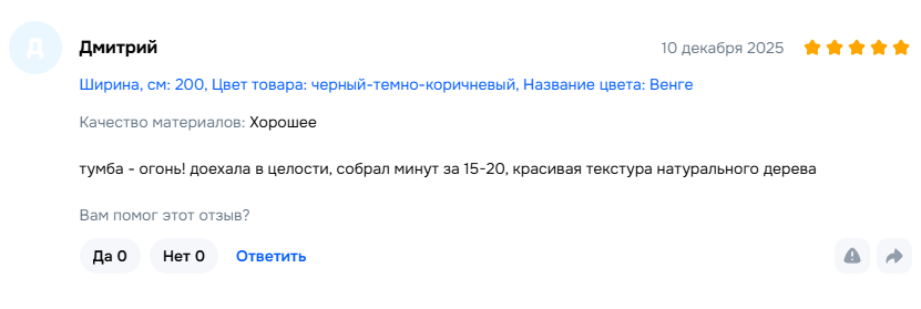 Обратились в данную компанию по совету знакомых. Решили приобрести тумбу под телевизор. Тумба из натурального дерева по приемлемой цене, интересный дизайн и отличное качество. Достаточно быстро доставили, имеется гарантия. Минусов мы не нашли. Рекомендуем!